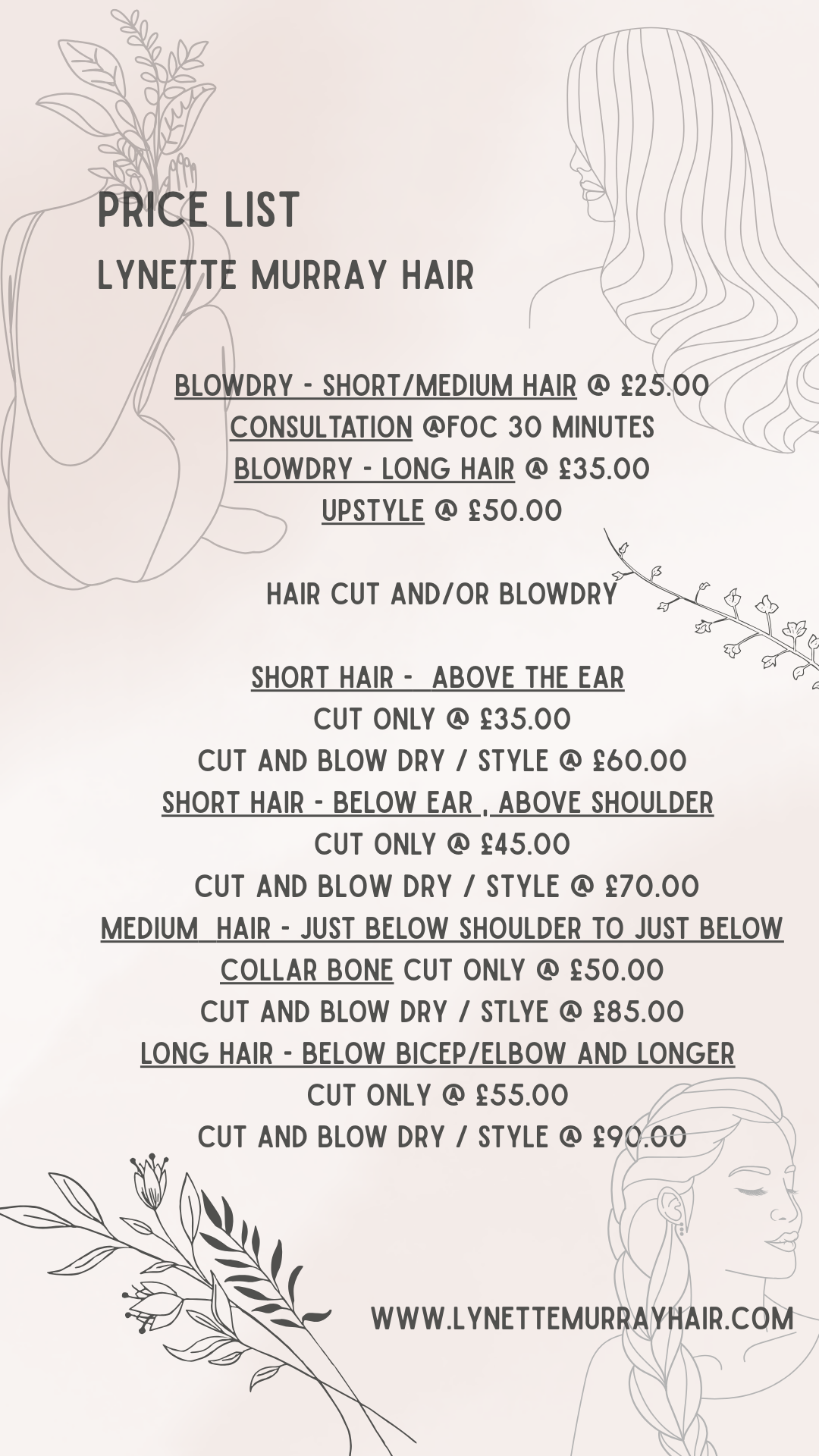 Let me explain my pricing structure, I had introduced it back in 2024 but never implemented it, so I now have. When in the studio I do everything for you, from taking your coat to making you tea/coffee and making your experience as lovely as possible. I work on a one to one basis so you will never be sharing your appointment with another client unless you have booked in with your partner and/or family member or friend. You can choose cut only and for this you get your hair washed and cut and the product added so you can let your hair dry naturally at home throughout the day or if you want it blow dried and styled also choose the cut and blow dry option xox
