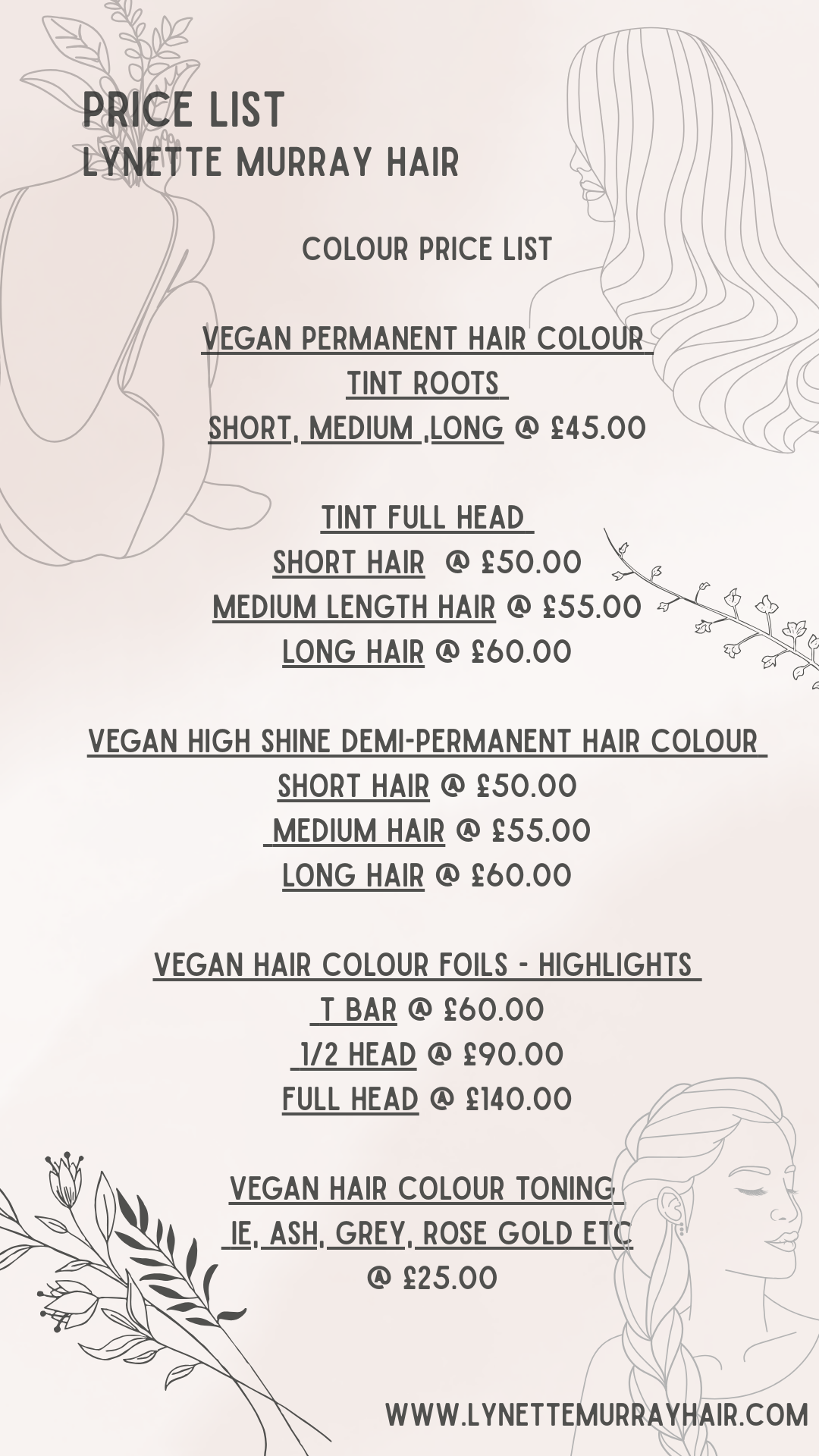 Your hair will be coloured using a premium Vegan colouring system. All colours are cruelty free, sulphate and paraben free. So need to worry about nasty smells or chemicals. xo